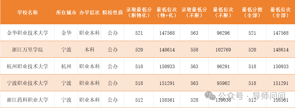 浙江省内登科最低的5所公办本科院校,从低到高顺次为浙江药科职业大学、杭州职业手艺大学、宁波职业手艺大学、浙江万里学院、金华职业手艺大学。