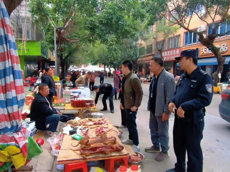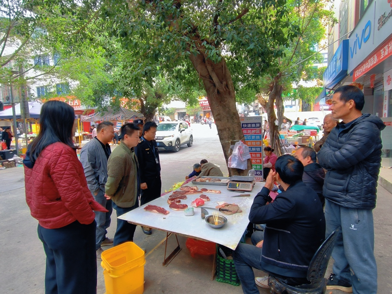 “食物平安没有‘零风险’,但监管必需‘零’。”时值岁暮平安防备环节阶段,同时外来肉类摊贩增加,给江口乡肉类食物平安提出新的要求。为切实保障人平易近群众吃上安心肉、平安肉,江口乡于日圩日买卖高峰时段,组织市场监管所、、乡分析法律大队开展结合专项整治步履,出力规范市场次序,守稳守牢群众的“肉盘子”。